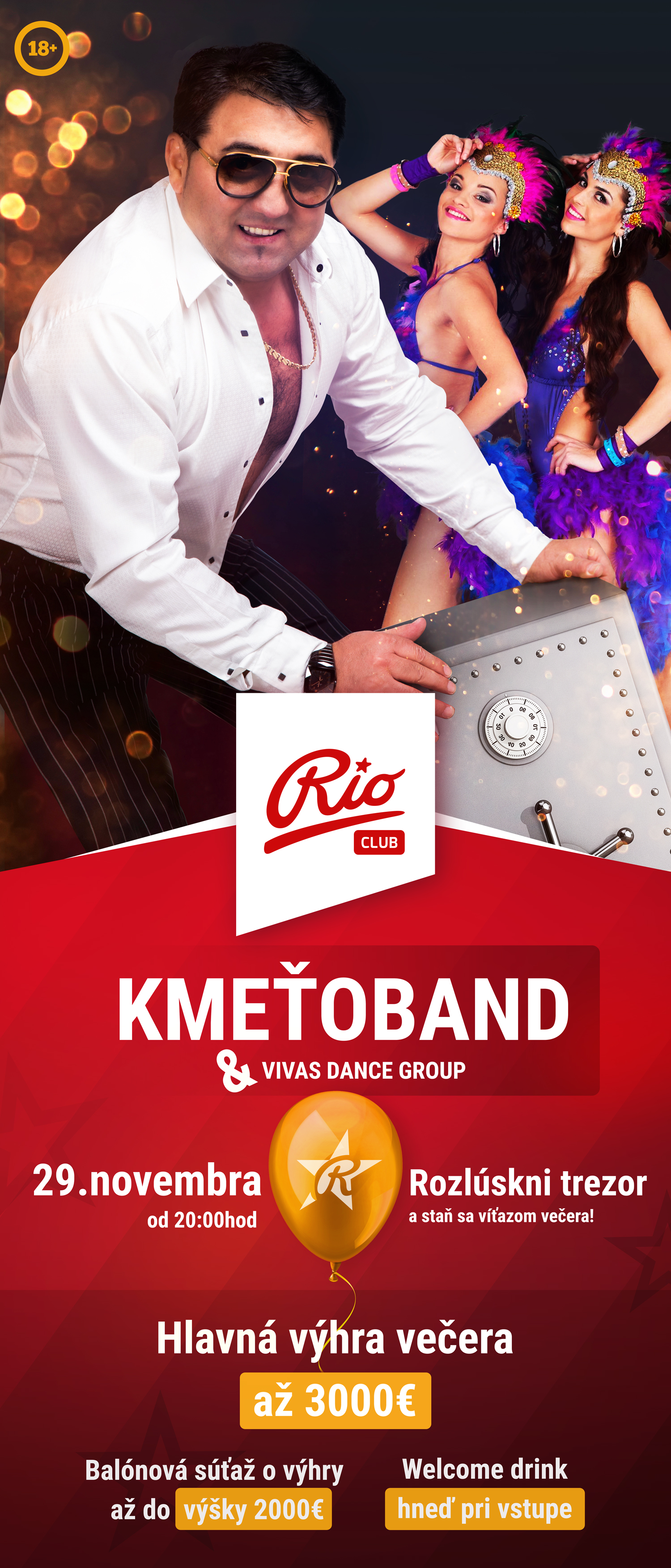 Pozývame vás na RIO Club Party v Martine! Jedinečná zábava a neskutočné výhry v RIO Clube už 29. novembra od 20:00hod. Tešiť sa môžete na hudobné vystúpenie kapely Kmeťoband, očaria vás tanečnice VIVAS a DJ bude hrať do neskorých hodín. Občerstvenie, alko/nealko a sprievodný program, ktorý dáva viacerým z Vás šancu vyhrať pekné peniažky. Nemusíte robiť nič, stačí prísť a možno práve Vy rozlúsknete náš trezor s hlavnou cenou večera až 3000€. Poznáte svet RIO Clubu? Ak nie, príďte nás navštíviť a zažijete večer plný príjemných prekvapení. Piatok, na ktorý ste dlho čakali. Zábava, šťastie, sexi tanečnice a dobrá spoločnosť. Tešíme sa na Vás v Rio CLub Martin, Jilemnického 4005/4A, sídlisko Sever.
